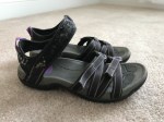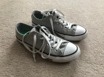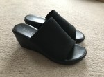 The footwear: black wedge heels, black sandals, and gray converse sneakers.