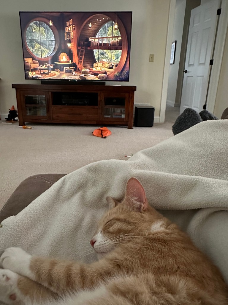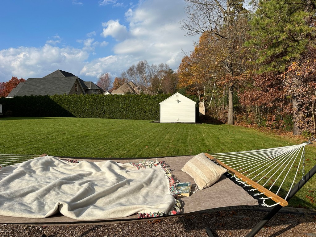 In November, Hannah introduced me to the Ambience videos on YouTube. I really liked the hobbit houses. The jazz coffee shops, and the Christmas scenes were also helpful in my efforts to slow down, especially on Sundays. The hammock I received the previous Christmas was not used as much as I would’ve liked to have used it. I wasn’t home a lot in the summertime and many times I like to be inside with Twinkie now.