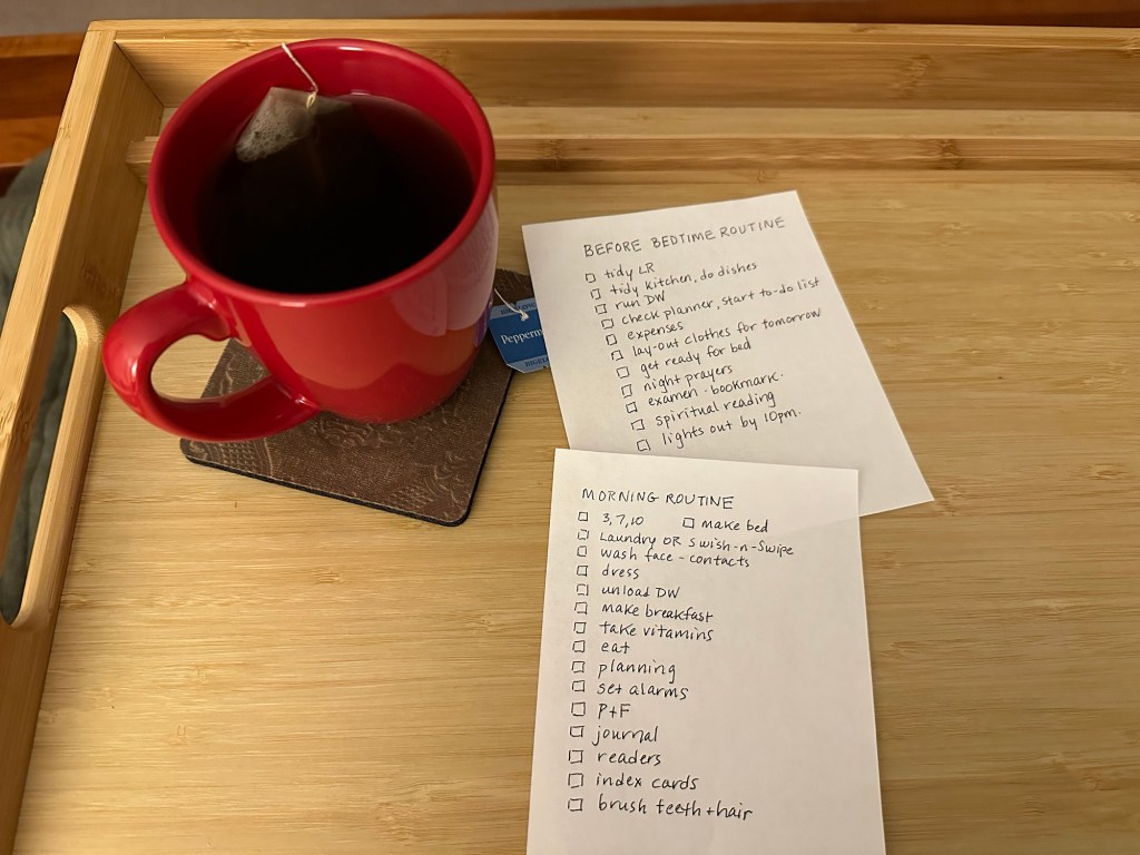 I think that routines are different than habits. I’ve read that they’re more intentional. They are a series of activities done regularly, together. I’ve been trying to establish a before-bedtime routine and a morning routine. I went old-school here. I wrote lists of things that I wanted to do before bed and in the morning; then I made copies of these lists and used a paper cutter. No high-tech methods for me. I am a box checker, so it’s quite fun. So far, I have been more successful with the morning routine. Many times I don’t start the bedtime routine early enough, and I skip parts of it. I will continue to practice. I believe in progress not perfection.