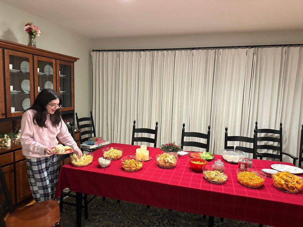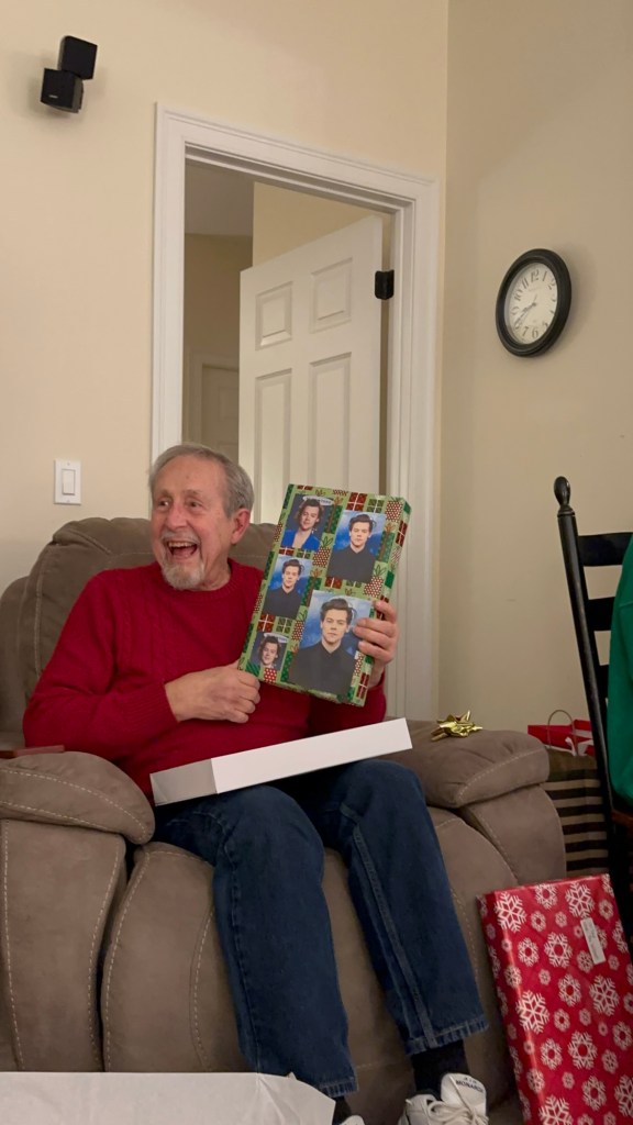 - After dinner on Christmas Eve, we played a game with a big ball of Saran Wrap. Then we opened presents and played Christmas musical bingo. It was a lot of fun. I laughed a lot because my father put pictures of Harry Styles all over Hannah‘s gift and told me to say when I handed out the presents that there was no name on the package and I didn’t know who it was for. Of course, everyone knew it was for her. At night, I went to the Midnight Mass. It was so beautiful. The only picture I took was of the three younger girls, with Christina, in their choir gowns.