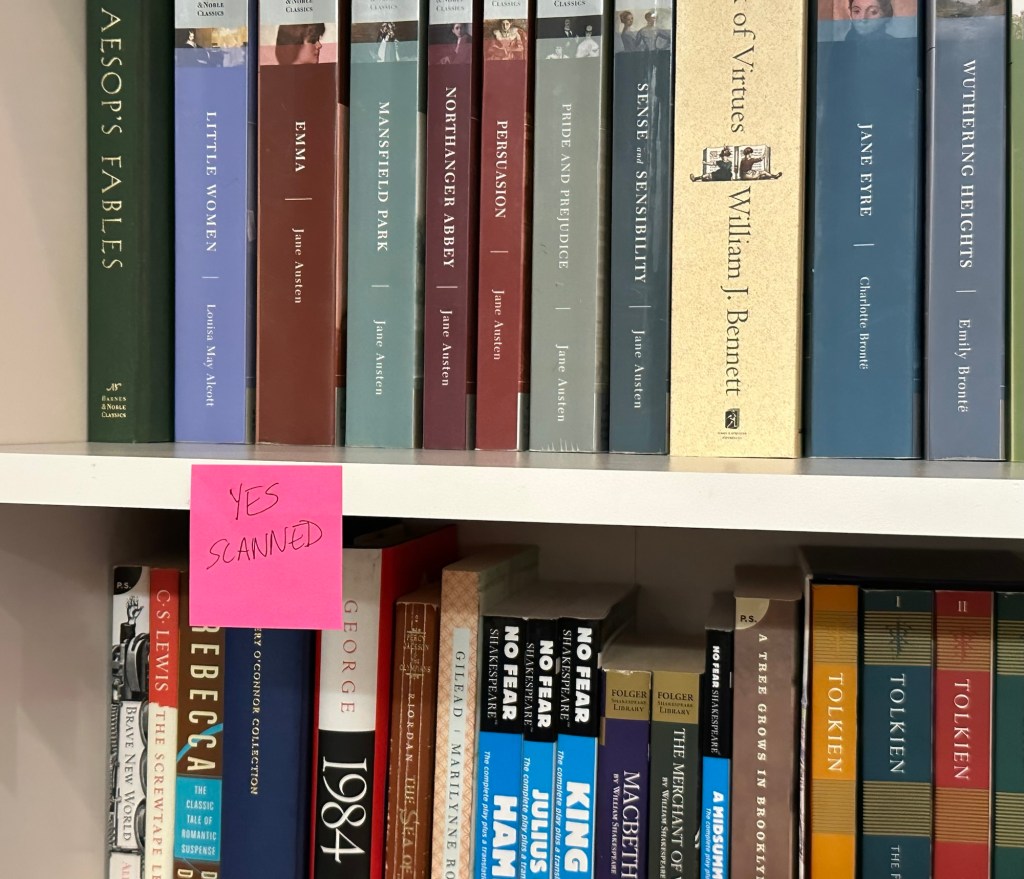 Anyway, this has been a successful purge. Here are the stats for “my” books (not including books in Bobby’s study or in the kids’ rooms). 12% of the books are no longer “mine”. They either belonged to someone else all along, or someone kept a book I was purging. 26% of the books are going out the door, some back to my sister and some are being donated. This means I have kept 62%, but I have let go of 38% of the books! I’m planning to do it again next March or April before the library book sale. Maybe then I’ll be ready to let go of more. For now, I am pleased that I am feeling lighter and freer. I wish I had a better word for it. Also, all of my books have assigned homes.