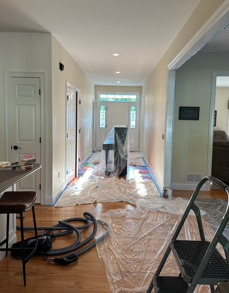 I’m in the middle (gosh I hope it’s the middle) of remodeling my foyer. As usual, I’ve underestimated the amount of time it’s going to take me to get the job done. I think I started on Saturday with the buying supplies, emptying the room, and spackling and sanding. I continued the prep work on Monday, and Tuesday morning. Then I covered the floor and taped some areas. I started painting the trim around 4:00 p.m. and finished the first coat around 11:00 p.m. Today I completed the second coat after working from 10:15-6:00. At some point, I noticed some pretty negative thoughts were going through my mind. The project was taking too long, I had a long way to go, it was looking awful so far, the house is a mess, this is so much work, I missed one of the last beautiful days of summer, I hope this comes out OK…