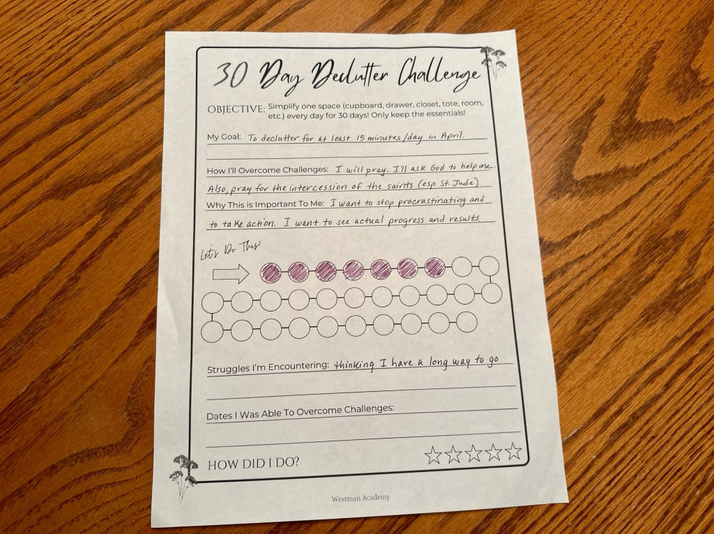 I already make my bed regularly. So for April, I’m giving myself another chance to succeed with the February habit. I’m calling it a “challenge” and I’m tracking my progress on a pretty little paper I found on this website. I just finished the first week.