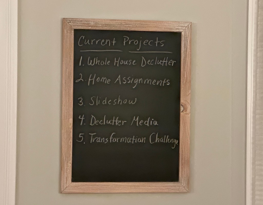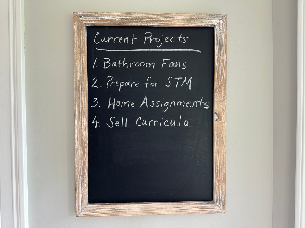 Let me explain. I have four projects that I’m working on this month. I post them on the chalkboard in my kitchen to constantly remind me of what projects I consider to be the current priorities.