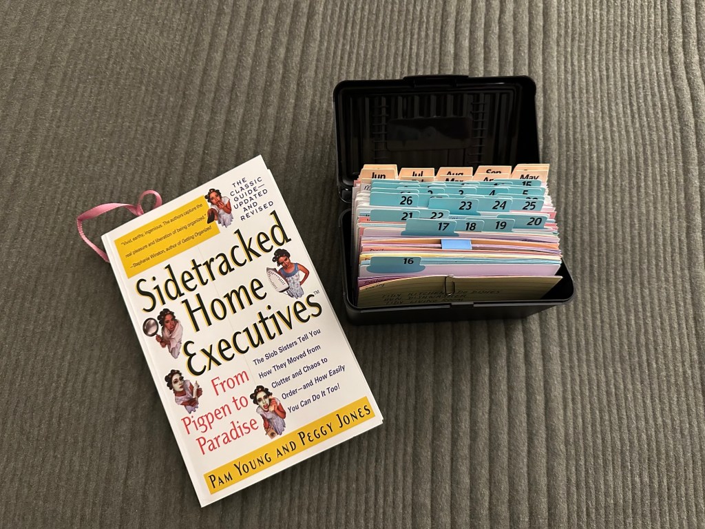 I also liked hearing the origin stories of many of the tools I’ve used for years. When I declutter, I usually sort into these boxes: GIVE AWAY, PUT AWAY, and THROW AWAY. (I call it TRASH.) I learned that they came up with the PUT AWAY box as an “anti-sidetracking device”. It was the breakthrough they were looking for because when they would go return items to other rooms, they would get sidetracked. With this “innovation” they would stay glued to the spot they were working on. I have added another box from this book called STORAGE. It’s suggested that these items get put aside in an area to be sorted when I’m ready to set up the storage area.
